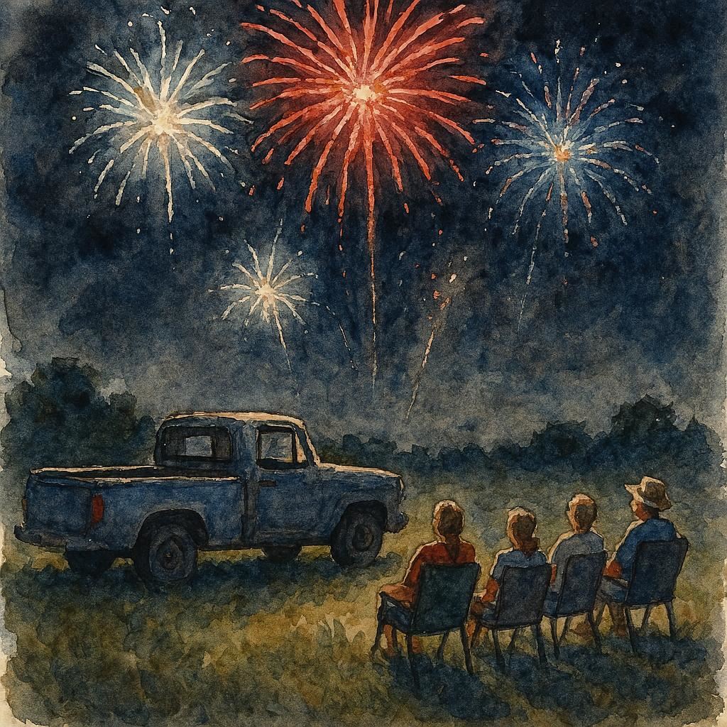 I’d been trying all day to find someone who could take us to see the fireworks, so I finally asked Allan. He agreed right away. Around 9 p.m., we all piled into the back of his pickup and headed to a great viewing spot. The town ice cream truck was nearby, and Allan treated the boys to ice cream before the show started.