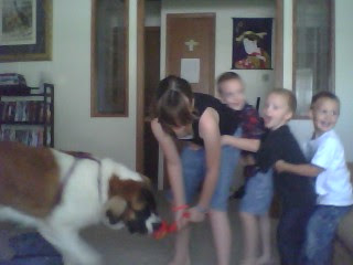 Last weekend, all the kids were playing together, like in the picture below. They were in a “train,” tugging Maizy along. Destiny and Cory wandered off to do something else, leaving Andy and Evan continuing their game. They were in the kitchen when, for some reason, Andy let go of the tug toy and fell butt-first onto Evan’s chest. Evan cried for a moment, then tried to get up and walk toward my mom. He grabbed his chest, ran into the cupboard door next to him, lost consciousness, and fell flat on his back on the kitchen floor.