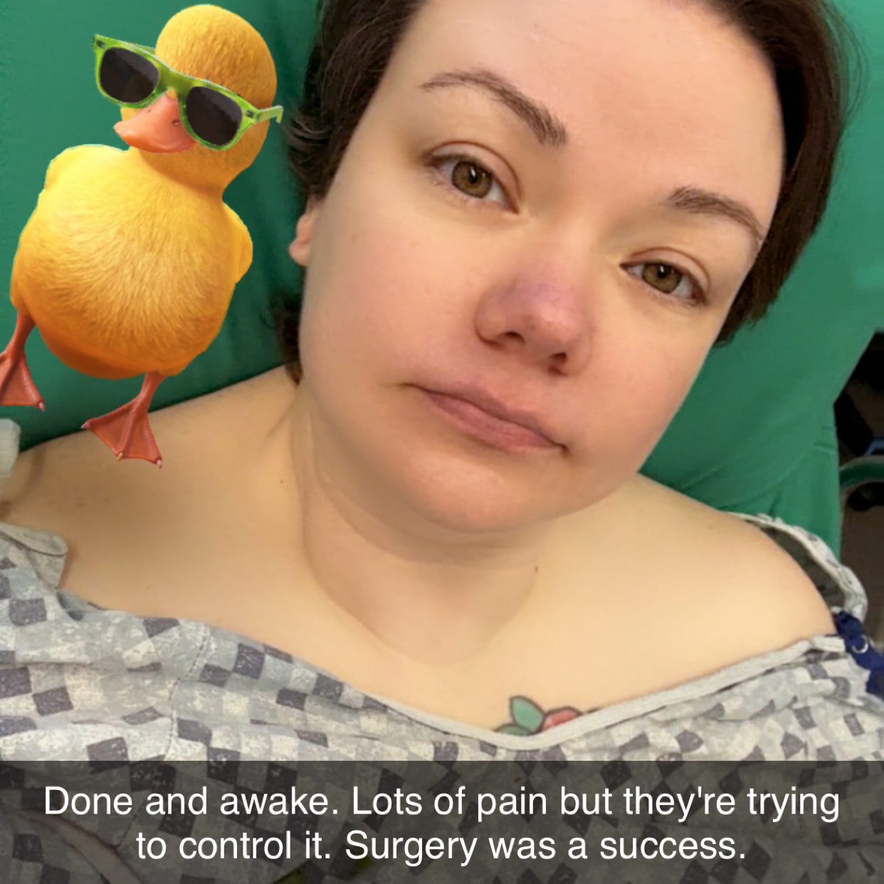 Since I didn’t consent to a spinal block, and only to general anesthesia, I woke up in agony. The surgery itself took less than 2 hours, and they told me I tolerated it well and everything went according to plan. But it was very difficult for them to get control of my pain in the first hour as I was coming out of anesthesia. I was given meds I didn’t even know where used in that situation, and after a while, that helped. By 2:00 PM they had gotten take-home prescriptions filled for me, given me lunch, had me walk the hall twice, helped me dress myself in my normal clothes, and had me in the car on my way home.